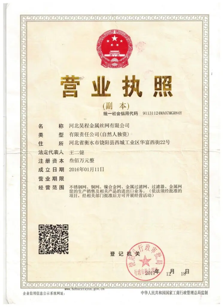 허베이 하오청 금속 철망 유한 회사는 2016년에 등록 자본금 300만 위안으로 설립되었습니다. 공장은 중국 철망 고향인 안핑 현에 위치하고 있습니다.