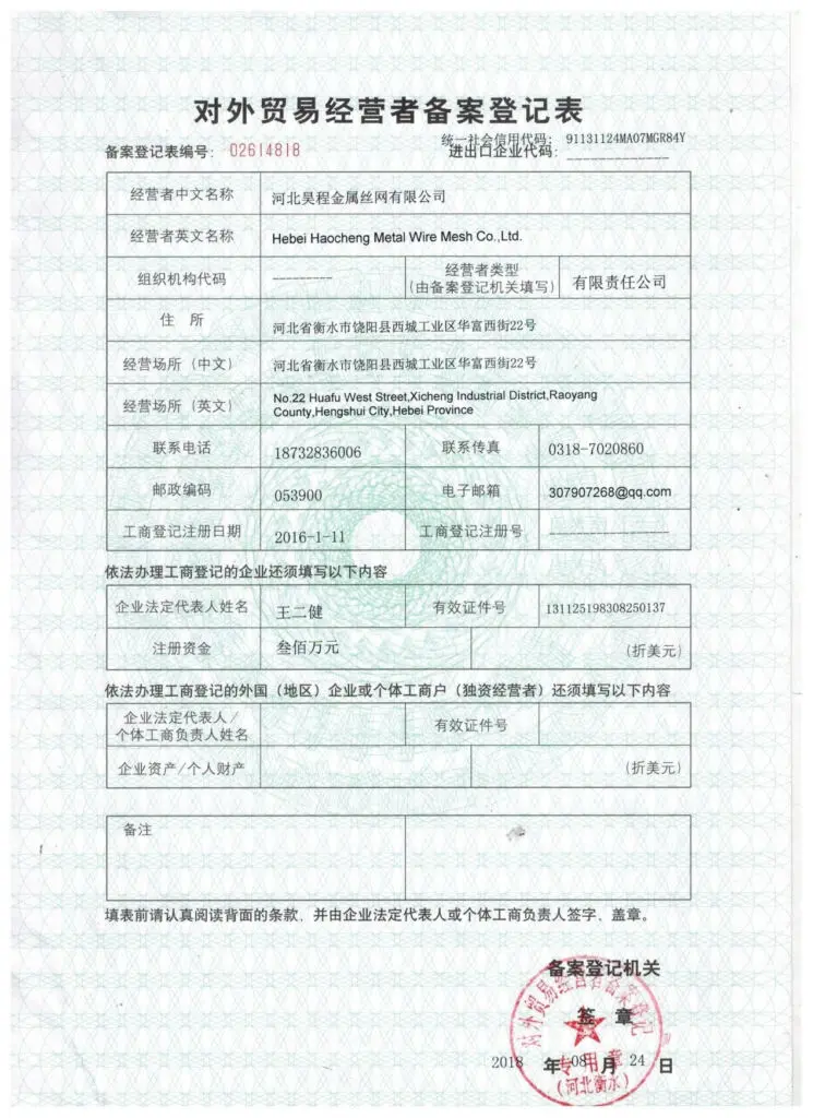 허베이 하오청 금속 철망 유한 회사는 2016년에 등록 자본금 300만 위안으로 설립되었습니다. 공장은 중국 철망 고향인 안핑 현에 위치하고 있습니다.